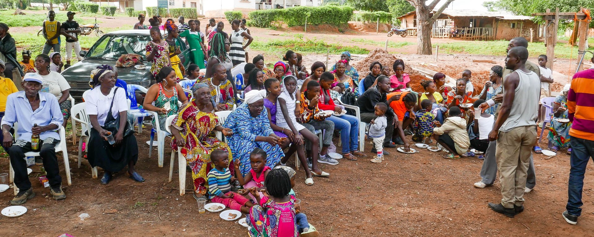 Am Samstag, den 21. Juli 2018 war der Tag der großen Feier. Nach dem Frühstück ging es zunächst in die Kirche, da die Kameruner Familie Adventisten des Siebenten Tags sind. Es schafften aber nur die Kinder und männlichen Familienmitglieder dahin, da die Frauen noch knietief in der Hausarbeit und den Vorbereitungen der Festlichkeiten steckten. Der Gottesdienst begann gegen 10 Uhr und dauert normalerweise 3 Stunden. Wir kamen deutlich später an, was aber kein Problem war. Der Chor sang laut und inbrünstig zu Gitarre und Tamtam. Die 8 Leute machten einen recht freudigen Krach. Auch die Gemeinde in der rappelvollen Kirche stand dem an Lautstärke in Nichts nach. Obwohl aus Rücksicht auf uns Gäste französisch gesprochen wurde, verstand ich nicht sehr viel. Ich meine, es wurden unter Anderem die Namen der Gemeindemitglieder verlesen und wie oft diese in letzter Zeit in der Kirche waren. Die Predigt wurde simultan ins Bamvele übersetzt. Gegen Ende stellte sich noch die Jugendorganisation in Pfadfinderuniform und militärischem Drill als eine Armee Gottes vor.